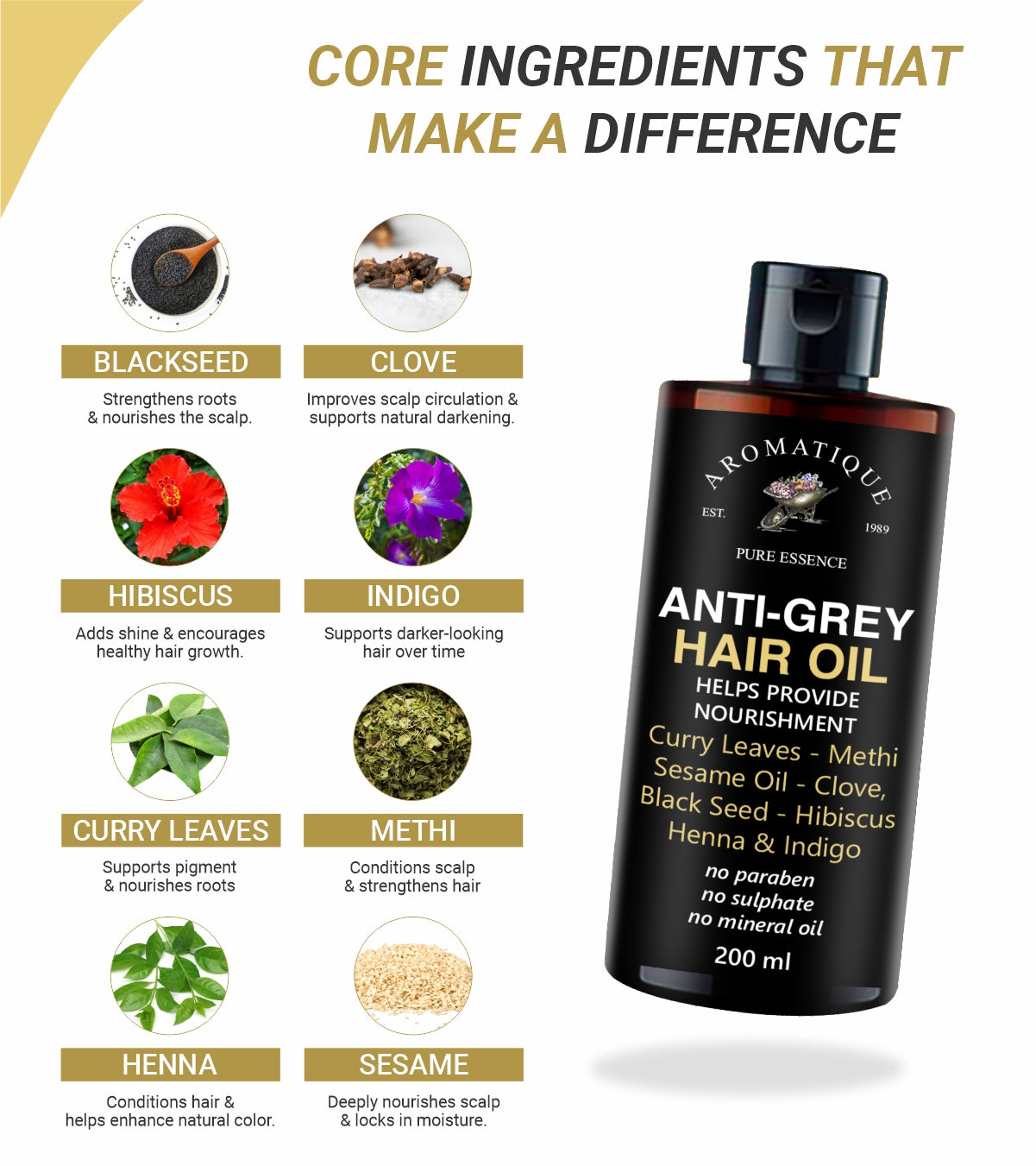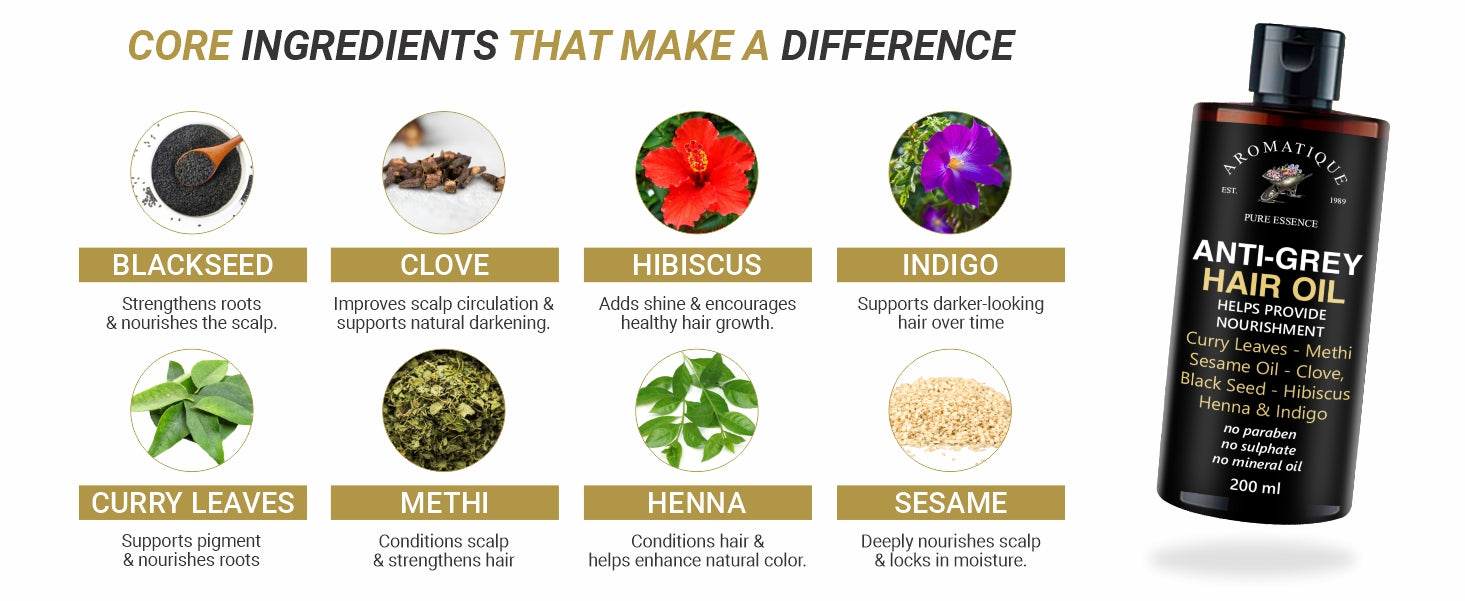 Anti-Grey Hair Oil Ingredients: Sweet Almond oil, Apricot oil, Moroccan Argan Oil, Methi, Jojoba oil, Coconut Oil, Castor Oil, Sesame Oil, Grapeseed oil, Curry Leaves Extract, Clove Oil, Blackseed Oil, Amla Oil, Hibiscus Oil, Henna & Indigo Extract.