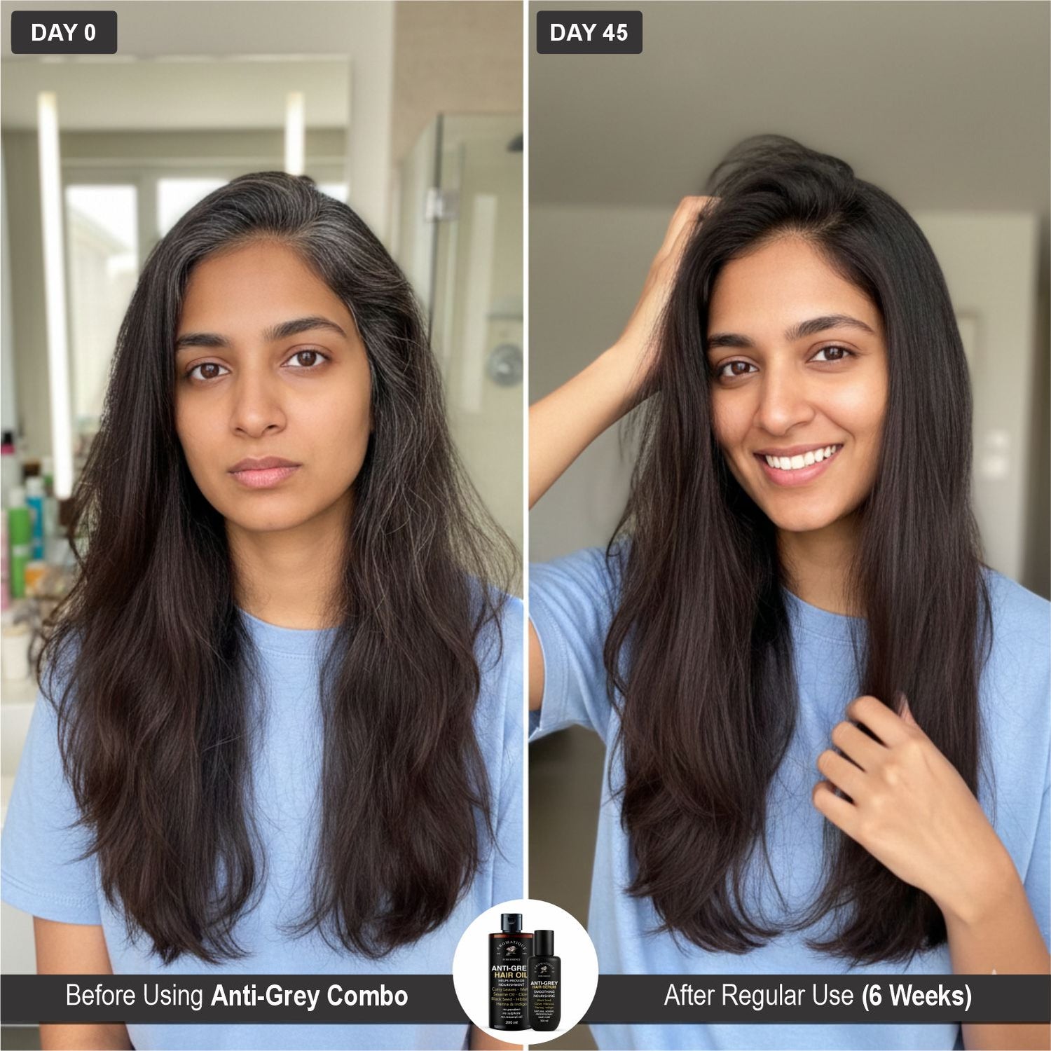 However, consistent use of this combo may help reduce the appearance of new premature grey hair by deeply nourishing the roots.