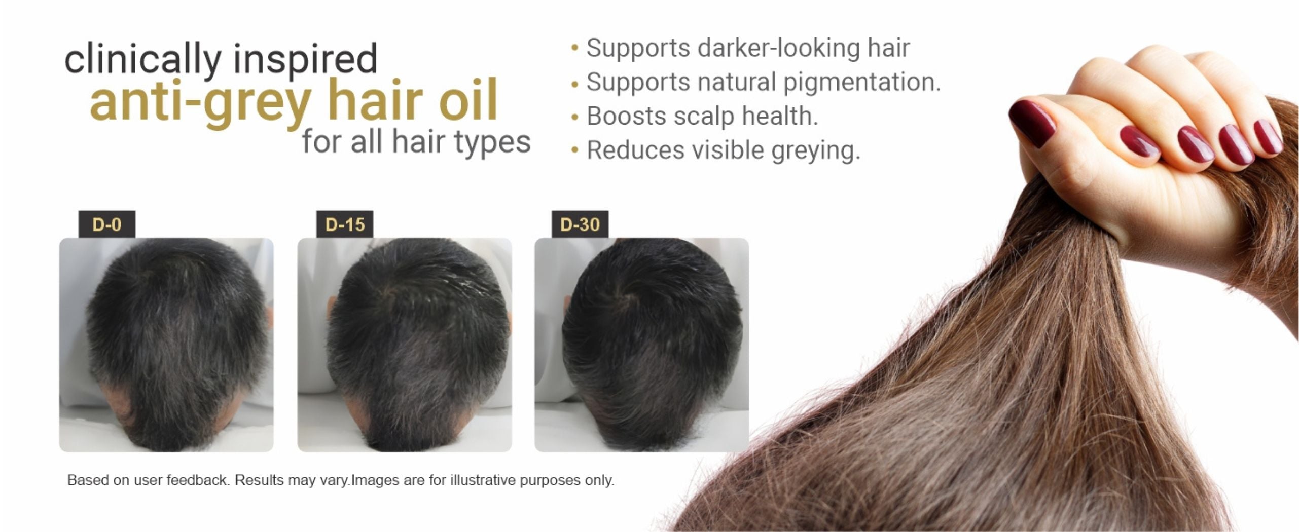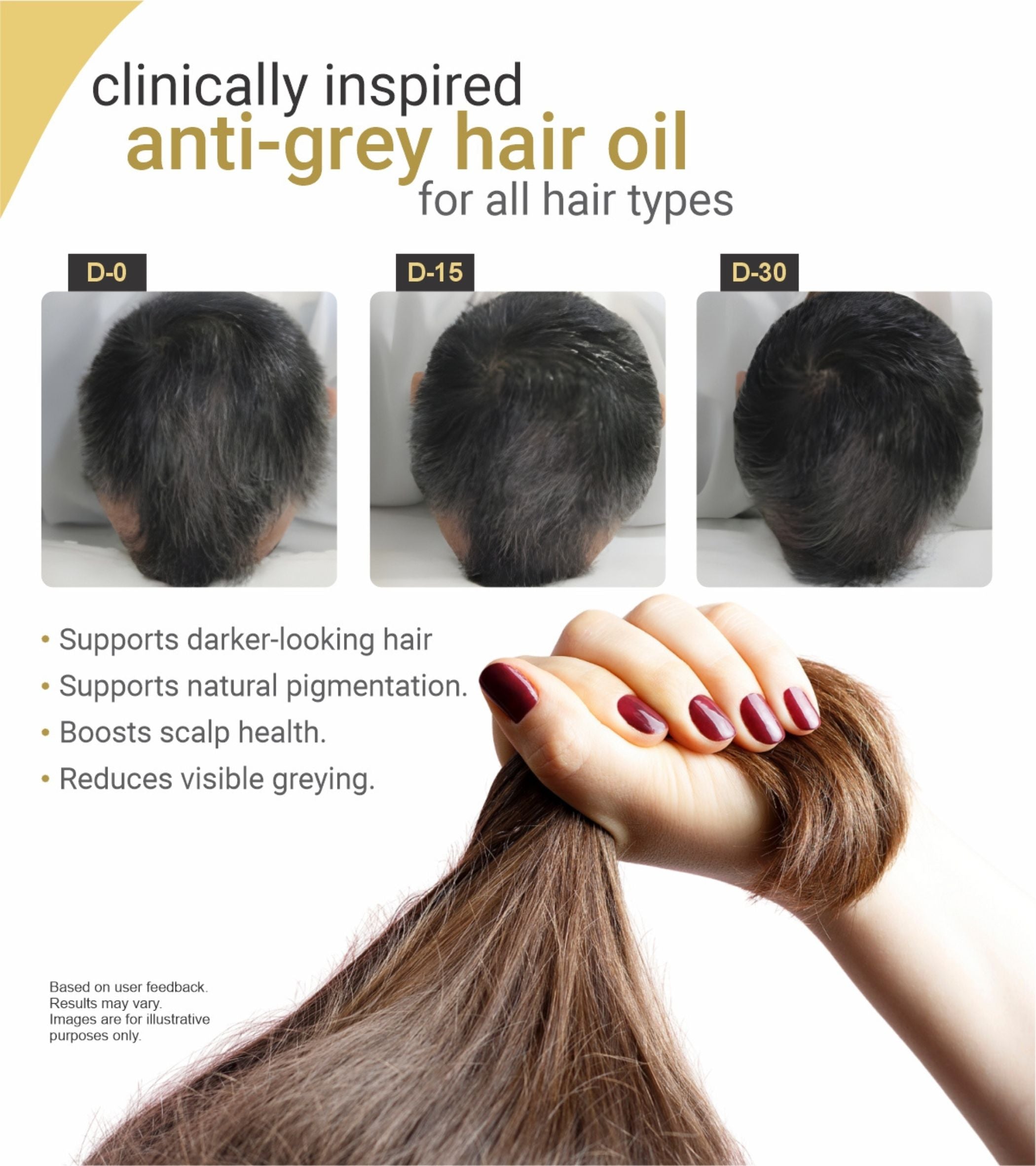 This hair oil supports hair pigment maintenance with herbs like Black Seed, Curry Leaves & Sesame Oil. Regular use may help improve the natural pigmentation of your hair and reduce the visibility of grey strands.
