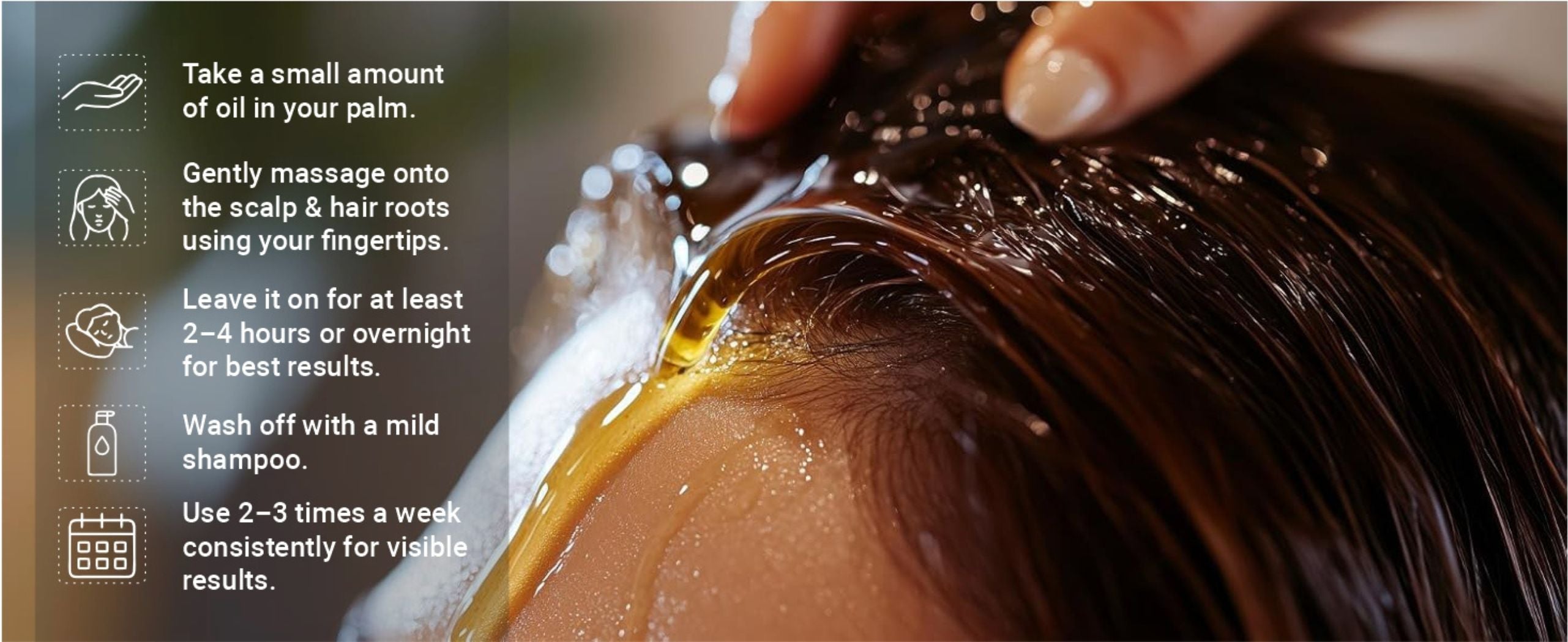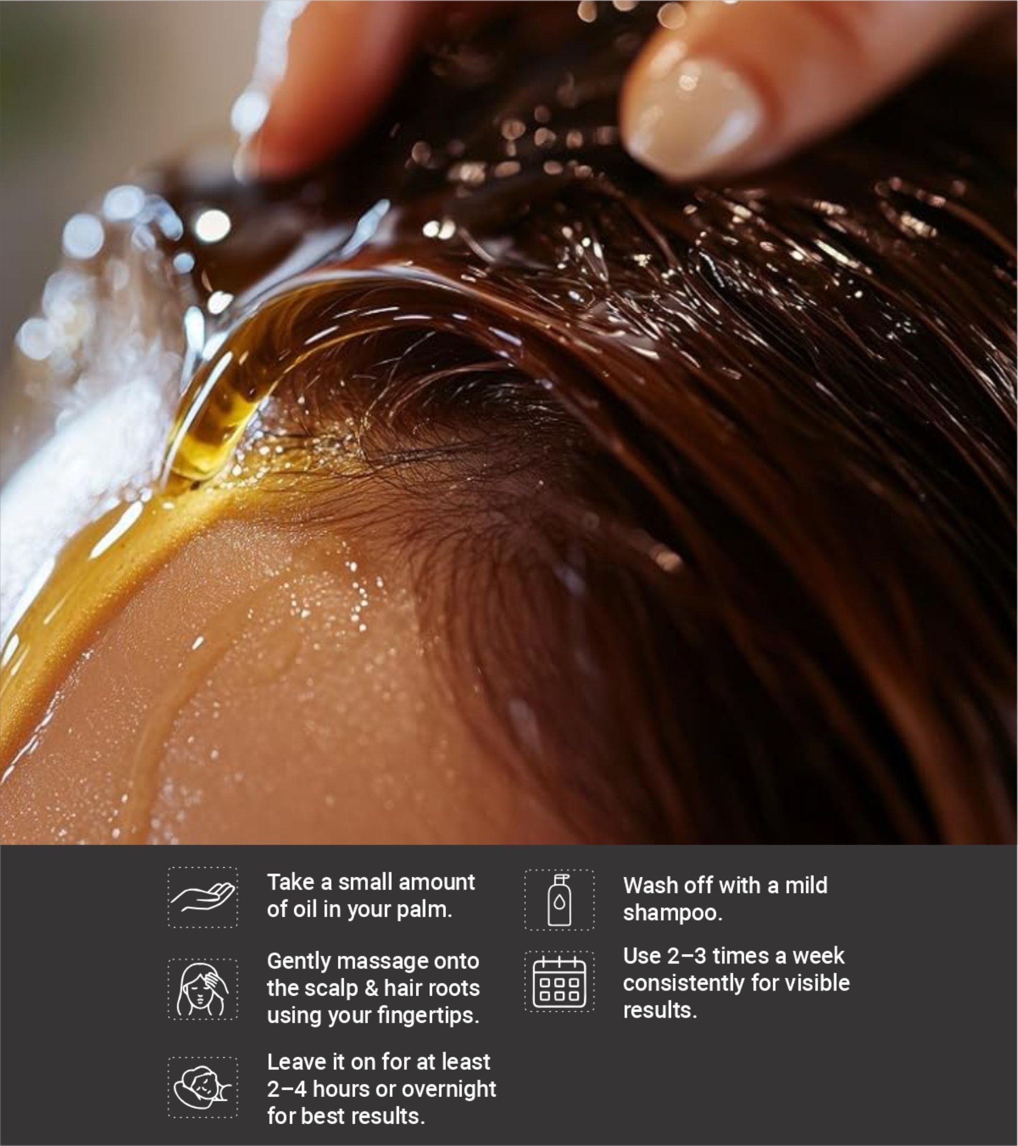 Take a small amount of oil and gently massage into scalp and hair roots. Leave it on for at least 2 hours or overnight for best results. Use 2–3 times a week. Wash off with a mild, sulfate-free shampoo.